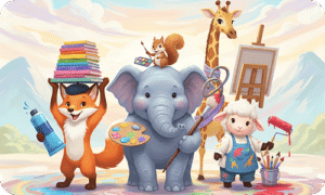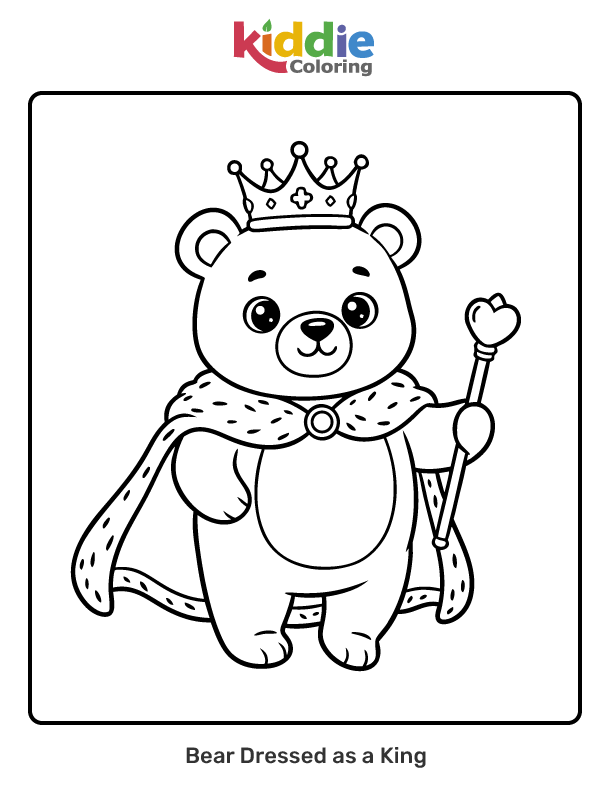 A regal cartoon bear wearing a crown and royal robes on a throne. Fantasy and dress-up fun.